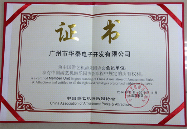 2014年广州市华秦bsport体育有限公司(简称:华秦游乐)成为中国游乐机游乐园协会会员单位,享有中国游艺机游乐园协会章程中规定的所有权利