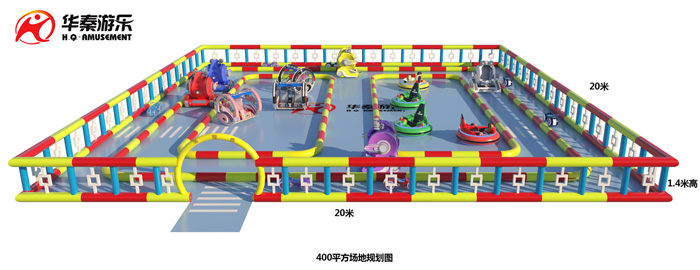 说明:1.2m外跑道放8台太子摩托车,1.7m跑道放铁甲威龙(尺寸1550*1520*1900mm)6台,4.9m*12.4m放3台乐逍遥,右框放4台太空飞船碰碰车。