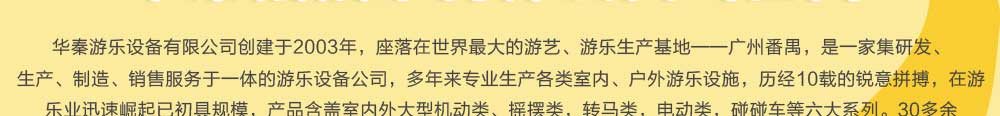 华秦bsport体育有限公司,历经10载的锐意拼搏,在游乐业迅速崛起已初具规模,产品含盖室内外大型机动类、摇摆类 ,转马类,电动类,碰碰车等六大系列。30多余项自主设计专利,在同行业中遥遥领先。这一切无不倾着我们每个华秦人 的心血。